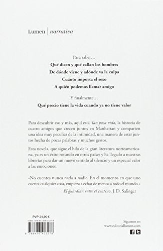 Para saber qué dicen y callan los hombres, de dónde viene y adónde va la culpa, cuánto importa el sexo, a quién podemos llamar amigo y, finalmente, qué precio tiene la vida cuando ya no tiene valor aquí está Tan poca vida: el libro icónico de las nuevas generaciones, considerado mejor novela del año por la prensa internacional, finalista del Booker Prize y del National Book Award, y uno de los mayores fenómenos literarios de la última década.